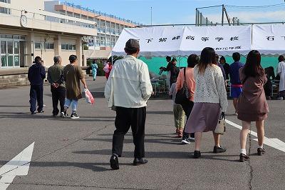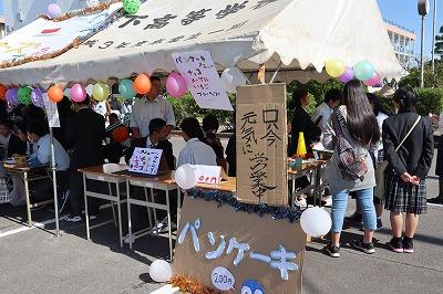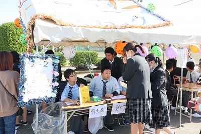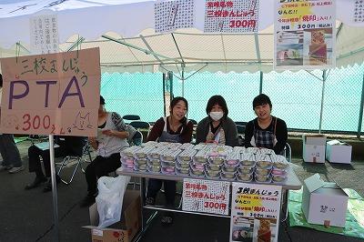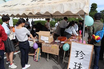 賑わいのあるテント村では,8クラスの企画と家庭部の焼き菓子,PTAによる豚丼・みそ汁・三校まんじゅうの販売がありました。
